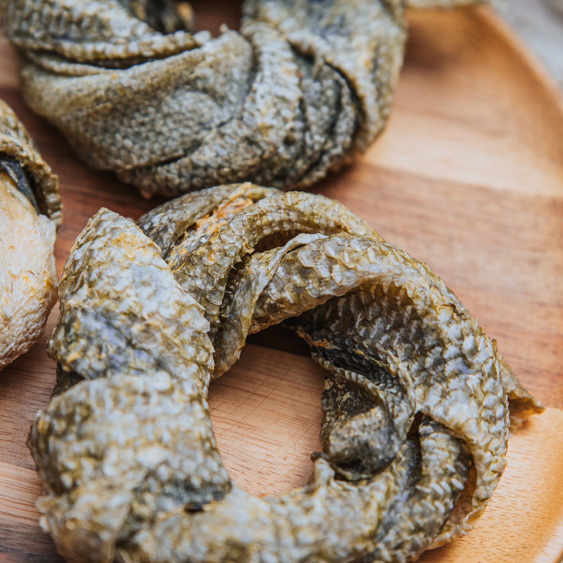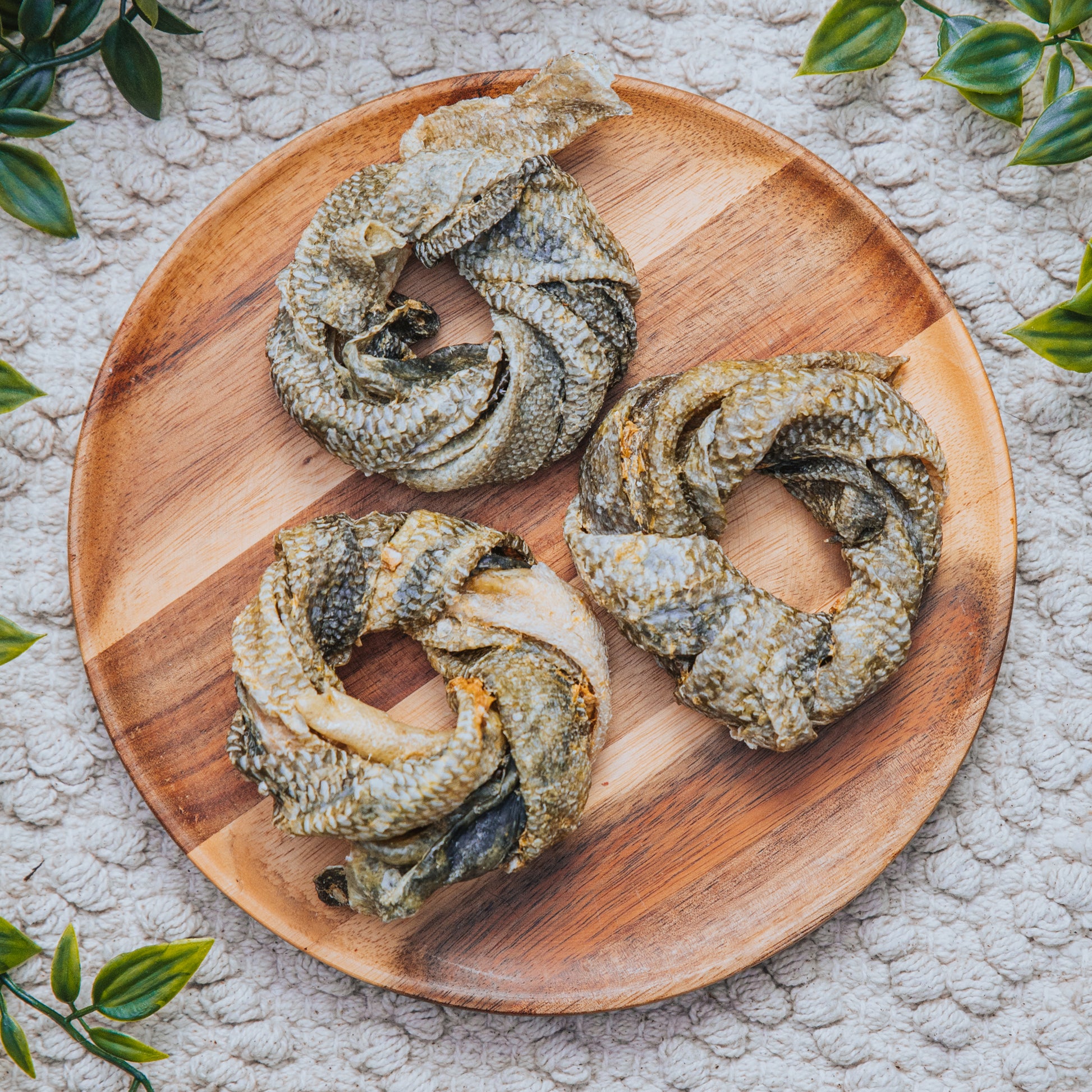 100% Cod skin rings are gently air-dried to preserve their rich flavour and nutrients, creating a satisfyingly crunchy texture dogs love. Naturally high in protein and omega fatty acids, this single-ingredient chew supports healthy skin, coat, and overall wellbeing while keeping dogs happily occupied.